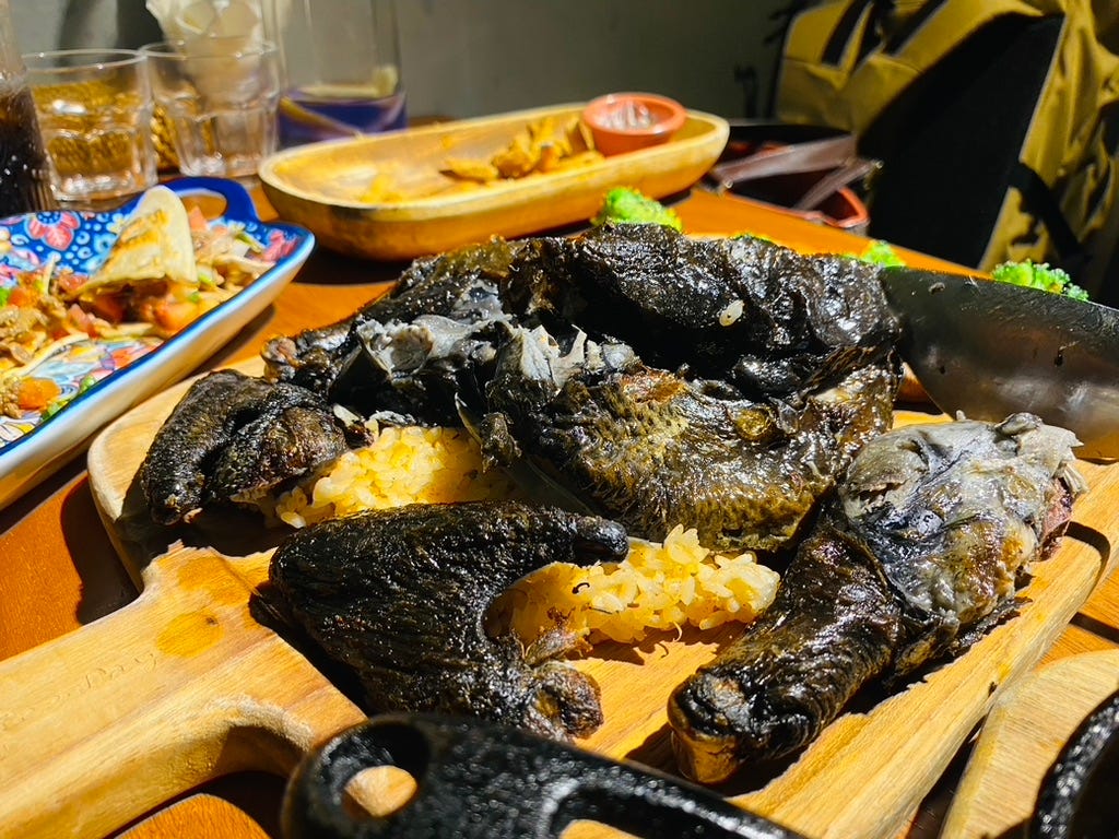 烤烏骨雞、黑衣炸雞外脆內嫩搭糯米,少見組合。松露烘蛋嫩滑,松露薯條療癒,適合和家人朋友聚餐。