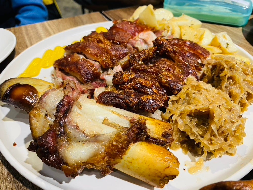 德式麵包扎實(真的口感像是歐式麵包,不是蓬鬆的歐式麵包)沙拉盒子甜菜根,沙拉口感好,烤豬腳預約制,皮脆肉嫩,點心也好吃!食材新鮮。一分錢一分貨,溫州街帶爸媽吃異國料理,聊旅行也是不錯
